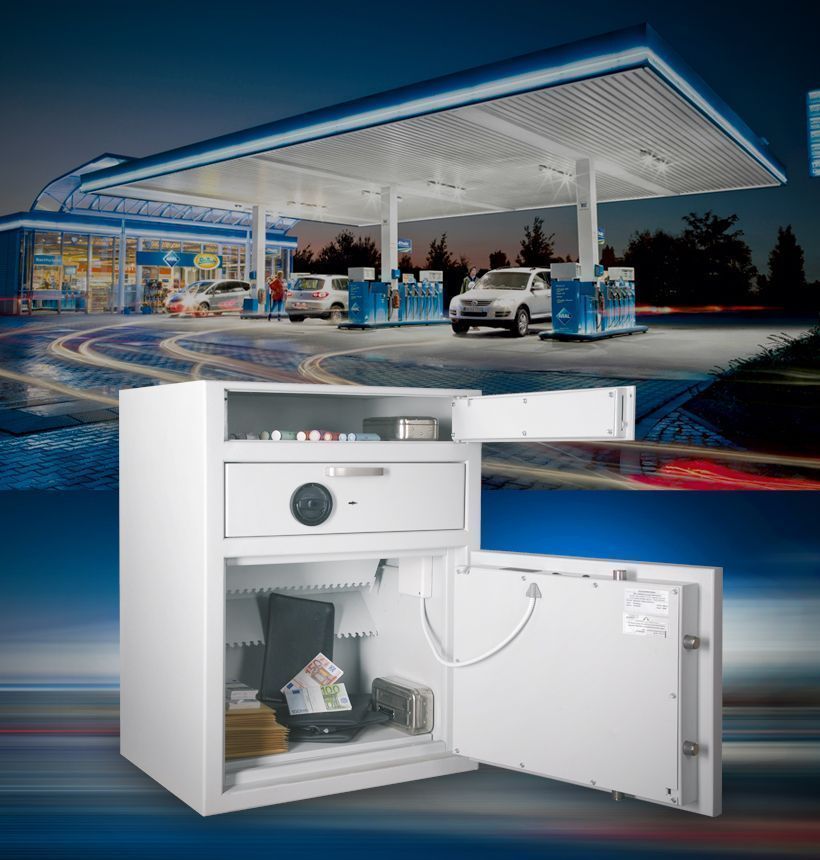 Speziell für Tankstellen bieten wir eine große und umfassende Produkt & Lösungspalette an. Neben Alarmsystemen und Videotechnik zur Sicherung gegen Spritdiebstahl und Überfall auch hochwertige Tresore. Den in allen Betrieben mit hohem Bargeldaufkommen, wie z.B Tankstellen und Waschstraßen, ist der sichere Umgang mit Tageseinnahmen und Wechselgeld ein wichtiges Thema. Eine ideale Lösung, um größere Geldbeträge auch während des laufenden Betriebs diebstahl- und überfallsicher unterzubringen, sind Einwurf- und Deposittresore. Diese Tresore verfügen über Schubladen oder Einwurfschlitze, die durch spezielle technische Einrichtungen gegen Eingriff und Entnahme geschützt sind. Systeme dieser Art bieten den Vorteil, Bargeld, aber auch Fahrzeugschlüssel, Papiere, Auftragstaschen o. ä. einwerfen zu können, ohne dass der Tresor dafür geöffnet werden muss. Alle Mitarbeiter können also etwas in den Tresor einwerfen, öffnen können ihn jedoch nur bestimmte dazu berechtigte Personen, z. B. der Inhaber oder Geschäftsführer. Darüber hinaus können unsere Lösungen auch im nachhinein erweitert werden durch Videoanlagen und Alarmsysteme. Sicherheit aus einer Hand!